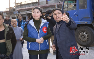 副县长尹建芳向晚安家居负责人介绍灾民现在生活情况(图:覃雪莲)