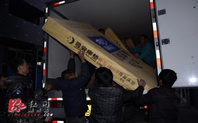 红网靖州站1月20日讯(分站记者 覃雪莲 通讯员 明旸梅)“让世界充满爱。”这是歌词,是标语,更是精神。1月19日下午,四辆大卡车载着“满满的爱心”抵达靖州寨牙。当天早上6点钟,湖南晚安家居实业 有限公司整队从长沙出发,历经10几个小时,千里迢迢给寨牙火灾村民送来价值75万余元的家居用品。