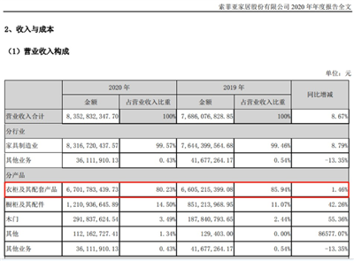 2020年前三季度财报披露之后,便有媒体和机构分析者指出,欧派衣柜的整体营收或已超越索菲亚衣柜,但是由于索菲亚2020年三季度报并没有披露衣柜极其配套产品的具体营收数据,该消息一直未被实锤。不过,随着欧派衣柜2020年财报数据的发布,实锤终于来了。