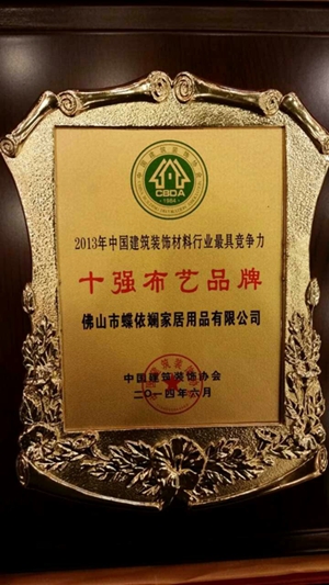 201461011日,由中国建筑装饰协会主办、中国建筑装饰协会材料委会员承办的首届中国建材家居产业发展大会在北京国际会议中心举行。大会发布了国内首部《2013年中国建材家居产业发展报告》,并对全国建筑装饰材料百强企业,行业十强品牌进行了颁奖,佛山市蝶依斓家居用品有限公司旗下品牌“蝶依斓”荣获十强布艺品牌殊荣。