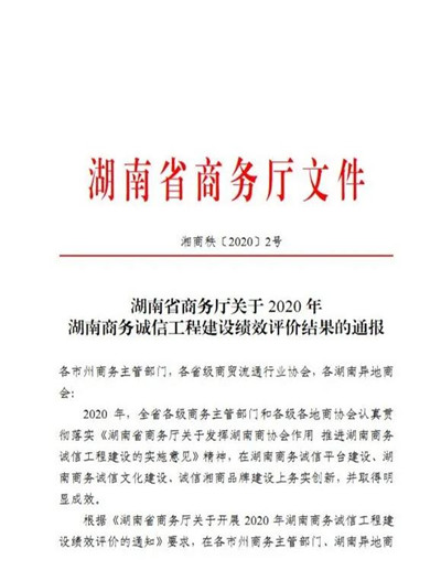 喜讯!在2020年湖南商务诚信工程建设绩效评中,经湖南省商务厅评定,百老汇官方网站 被认定为2020年湖南商务诚信工程建设先进单位!