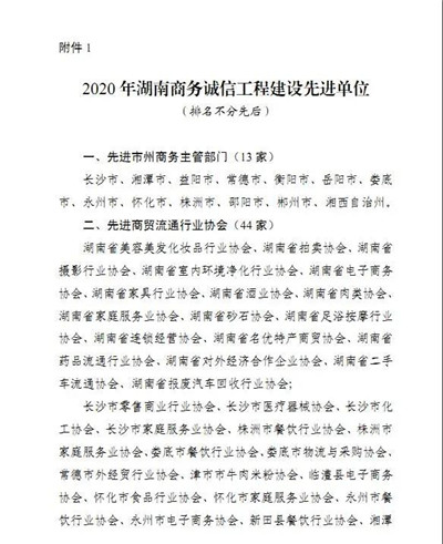 喜讯!4001澳门老百汇网址是多少 获评2020年湖南商务诚信工程建设先进单位 !