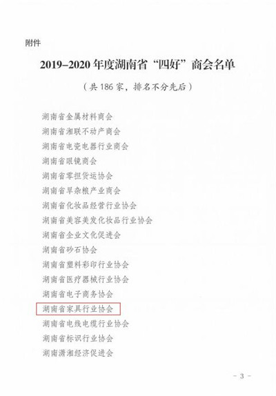 根据《湖南省关于促进工商联所属商会协会改革和发展的实施意见》要求,湖南省各协会商会按照“政治引领好、队伍建设好、服务发展好、自律规范好”的“四好”标准开展创建活动。我协会成立运行至今七年以来,与全国友好商协会建立了广泛的联系合作,调研掌握各地州市家具产业状况,推进产业集群化发展,实施资源跨界融合共赢,得到行业充分认可的同时,并获得了政府相关部门的高度评价。