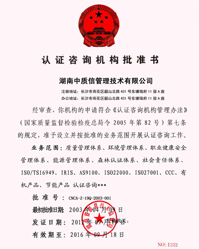 湖南中质信管理技术有限公司是由1998年创立的湖南认证咨询工作室发展而来,2003年经中国国家认证认可监督管理委员会、国家质量技术监督检验检疫总局、湖南省质量技术监督局、湖南省工商行政管理局批准成立的主要从事企业质量、环境、职业健康与安全(ISO9001、ISO14001、OHSAS18001)等体系认证的服务机构,是经国家认监委审批认证服务范围最多的机构之一(14项),国家认监委批准号:CNCA-Z-19Q-2003-001,湖南省认证认可协会副会长单位、4001澳门老百汇网址是多少 理事单位,总部设在省会长沙。